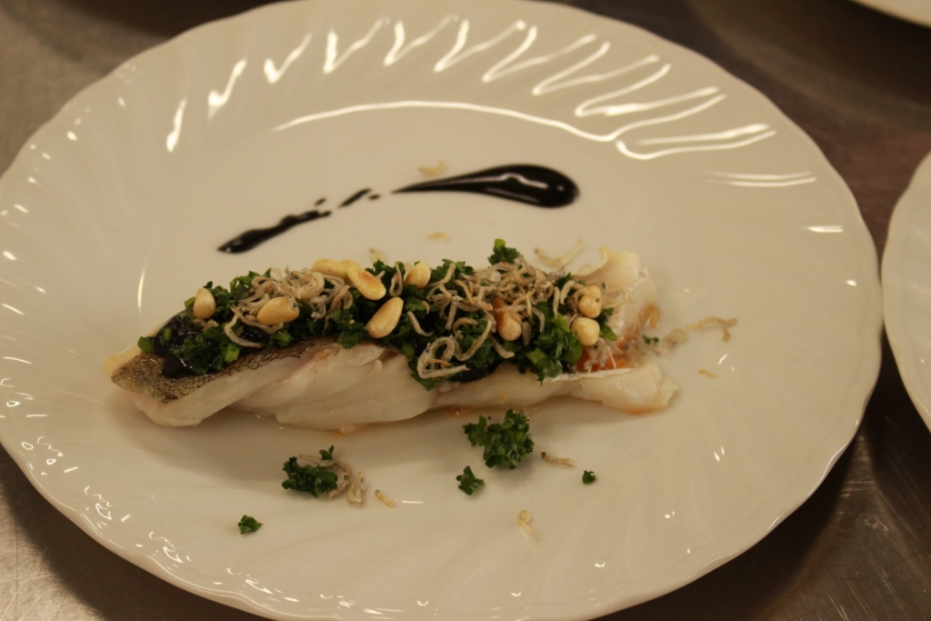 鱈のソテー 黒ゴマのソース 松の実とじゃこのカリカリ
